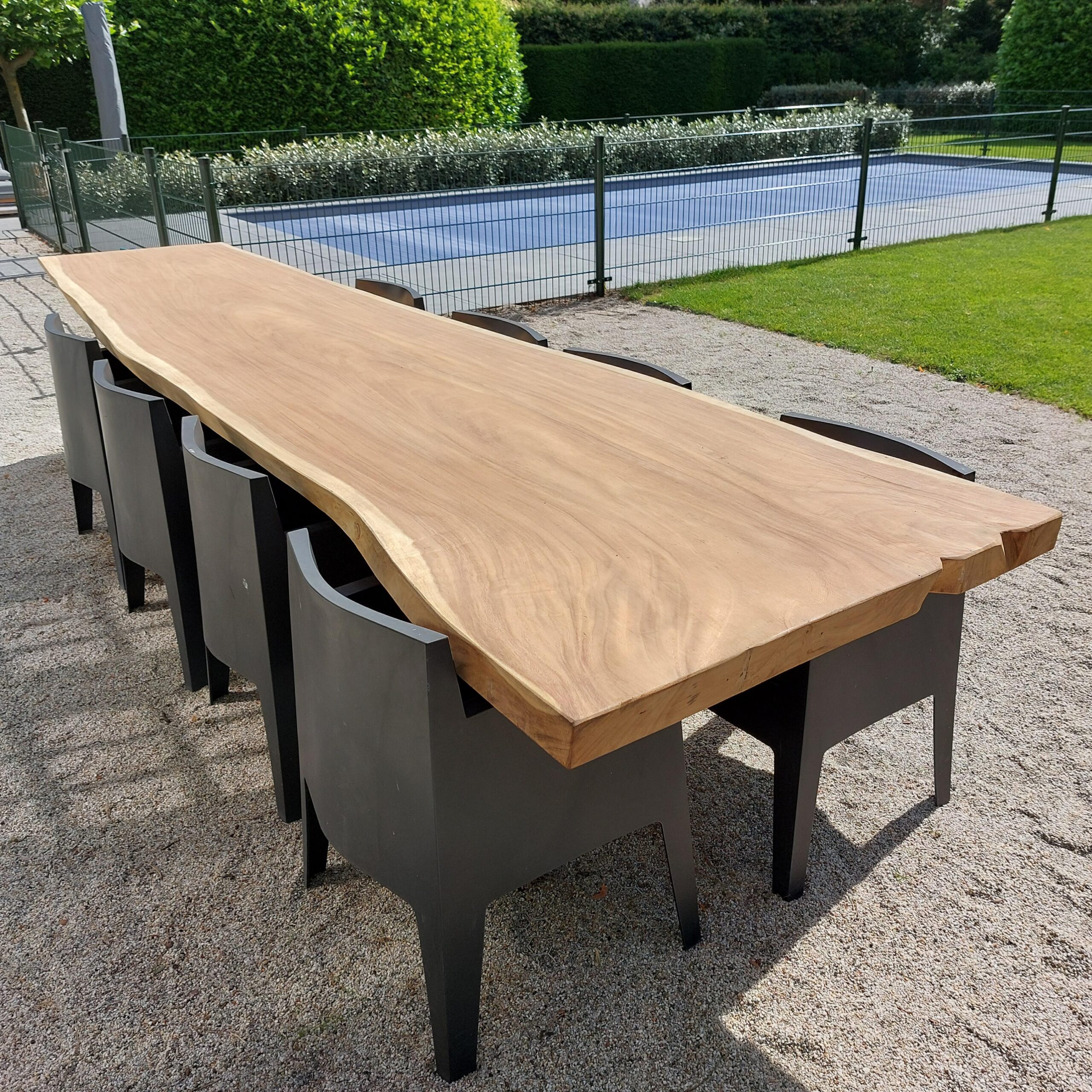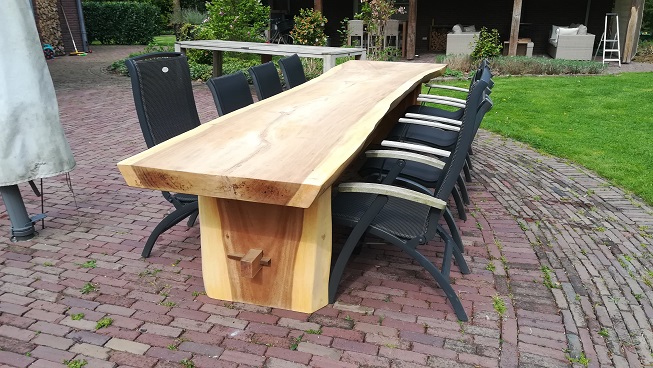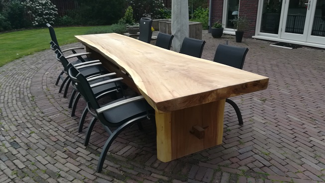 Deze loodzware boomstam tuintafel is maar liefst 4m lang. Het dikke tafelblad geeft sfeer in iedere tuin of op ieder terras.