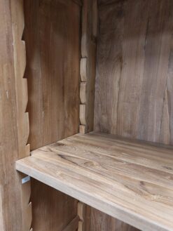Het meubel is vervaardigd uit oud gerecycled teakhout, wat zorgt voor een robuuste uitstraling en een lange levensduur. De natuurlijke nerven en kleurschakeringen maken iedere kast uniek en geven karakter aan je interieur.
