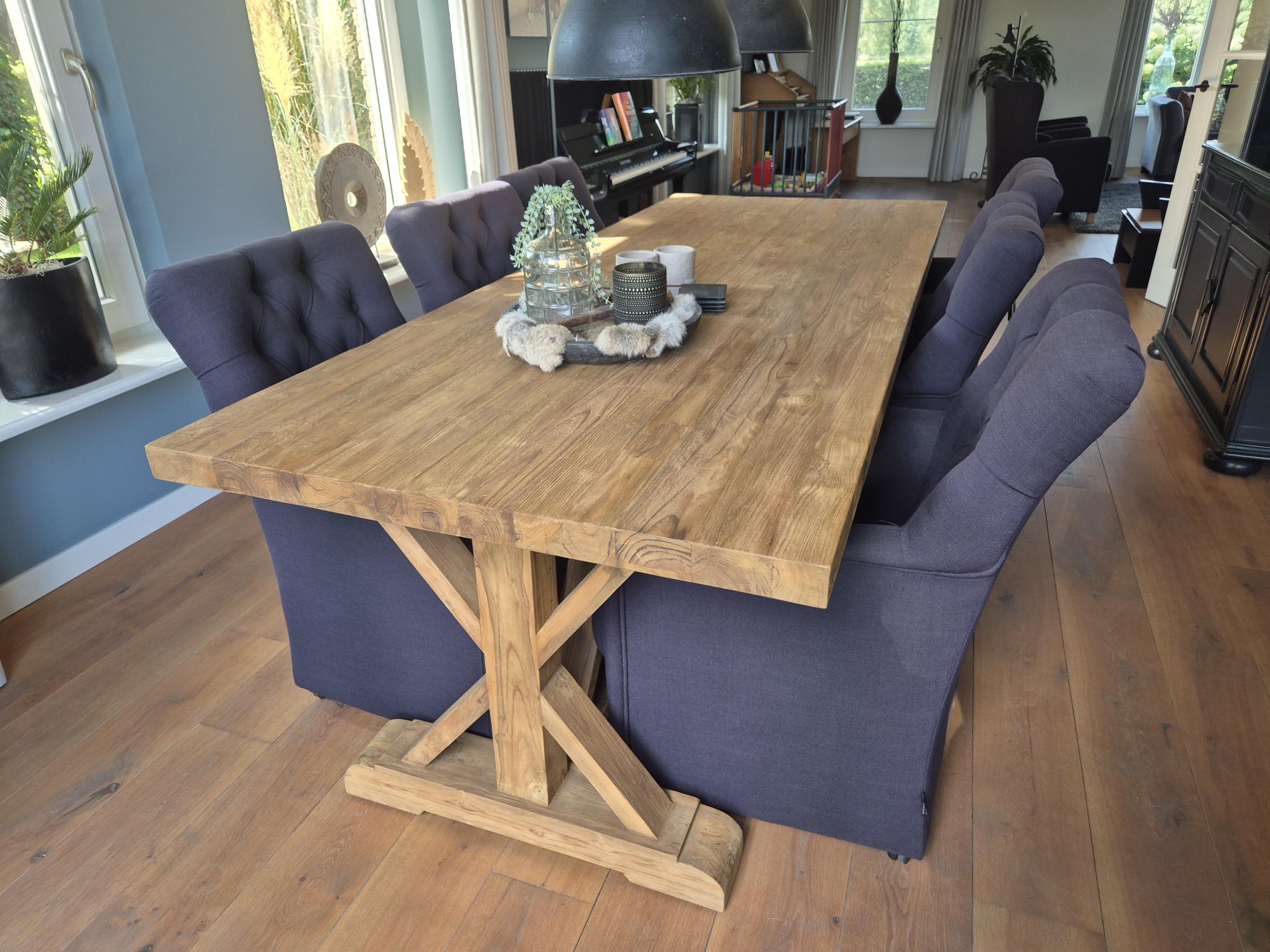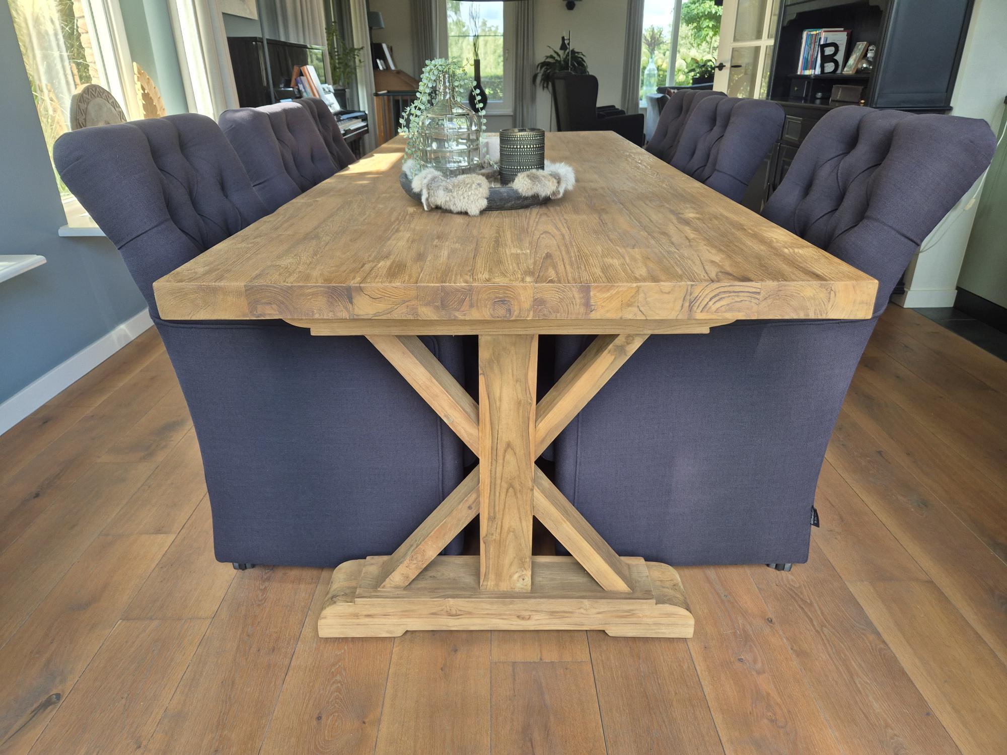 Op zoek naar een royale eettafel die warmte en karakter toevoegt aan je interieur? Deze teakhouten eettafel van 250×100 cm combineert robuuste uitstraling met ambachtelijk vakwerk. Gemaakt van massief oud teak, is deze tafel niet alleen duurzaam, maar ook uniek in zijn uitstraling dankzij de geborstelde afwerking. Hierdoor komt de natuurlijke houtstructuur prachtig naar voren. Deze kloostertafel heeft een balk die tussen de poten loopt. Het is ook mogelijk de tussenbalk achterwege te laten. Het tafelblad is massief en 5cm dik. Het is ook mogelijk de dikte aan te passen.