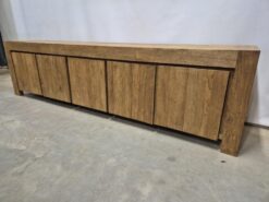 Dit dressoir is geheel naar wens van een klant gemaakt. De kast heeft vijf greeploze deuren en is 248cm breed, 45cm diep en 65cm hoog. Het dressoir is handgemaakt in Indonesie van oud gerecycled teakhout. Het teakhout is geborsteld afgewerkt waardoor het zijn robuuste uitstraling krijgt.