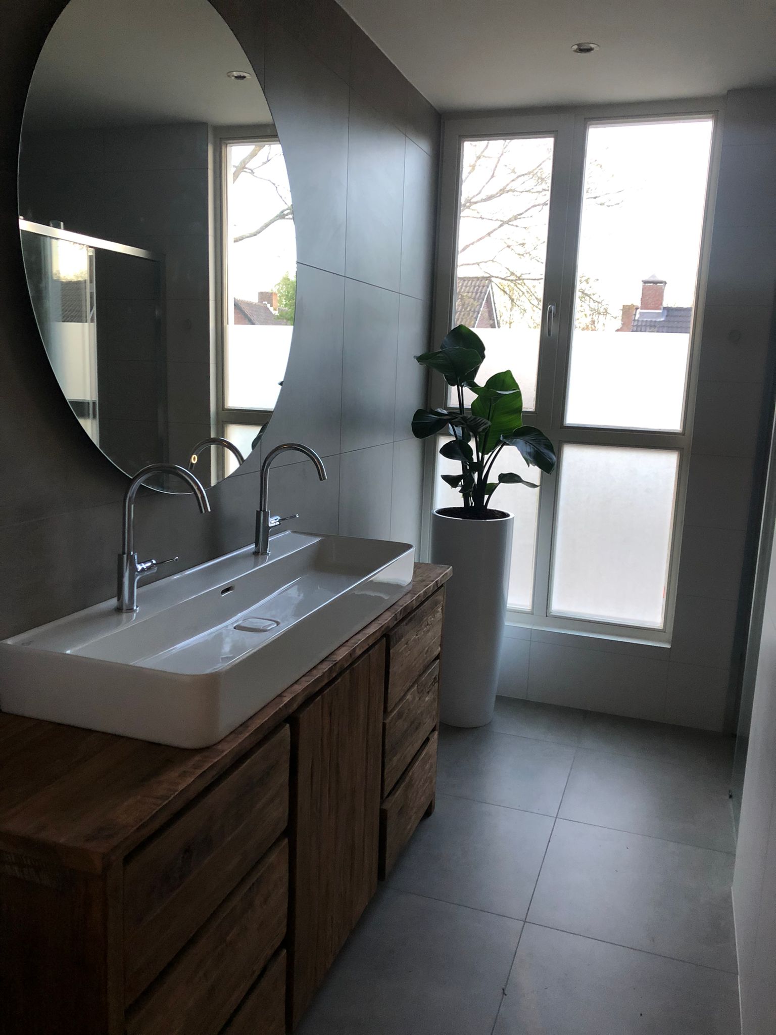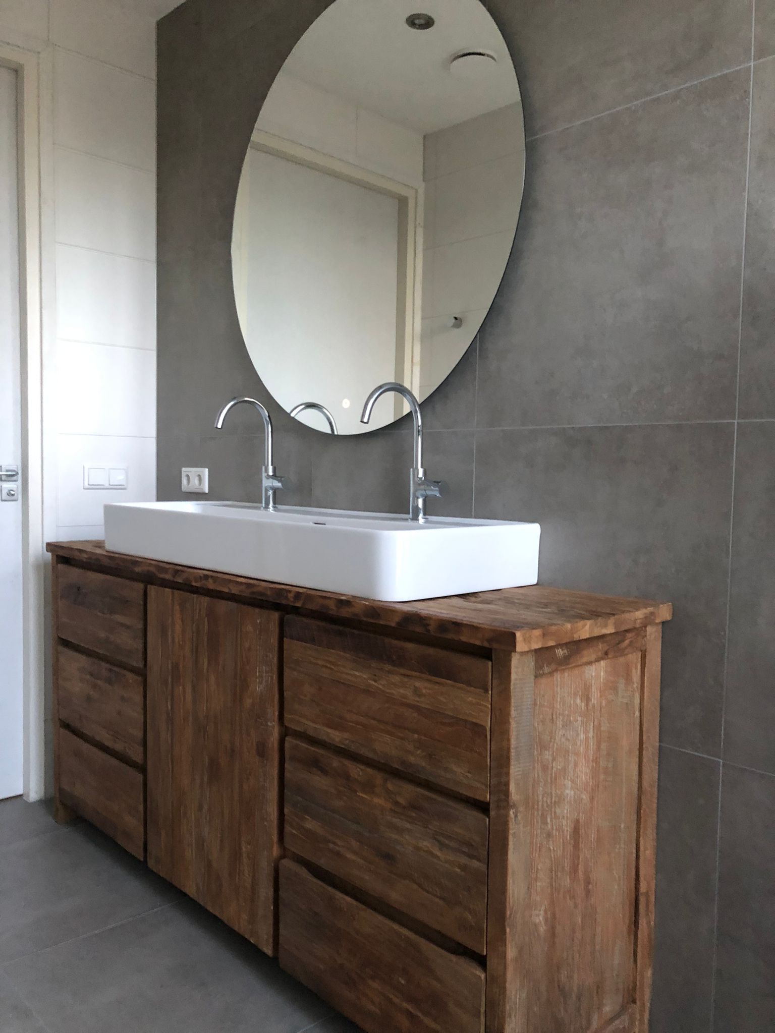 Deze grof houten badkamerkast is op maat naar wensen van een klant gemaakt. Het badkamer meubel is gemaakt van oud gerecycled teakhout. De kast heeft zes greeploze laden en een deur waar de sifon achter is weggewerkt. Dit badkamermeubel is 180x50x85cm groot.
