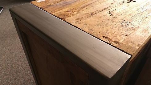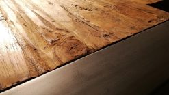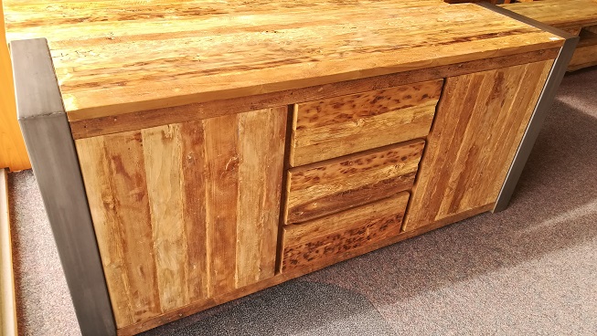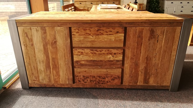 Dit industriële dressoir is 200cm breed, 50cm diep en 90cm hoog. De kast is gemaakt van oud en gerecycled teakhout. De strakke kast heeft twee greeploze deuren met daar achter een schap en drie greeploze laden. Het oude teakhout van de kast heeft nog de oude grove structuur.