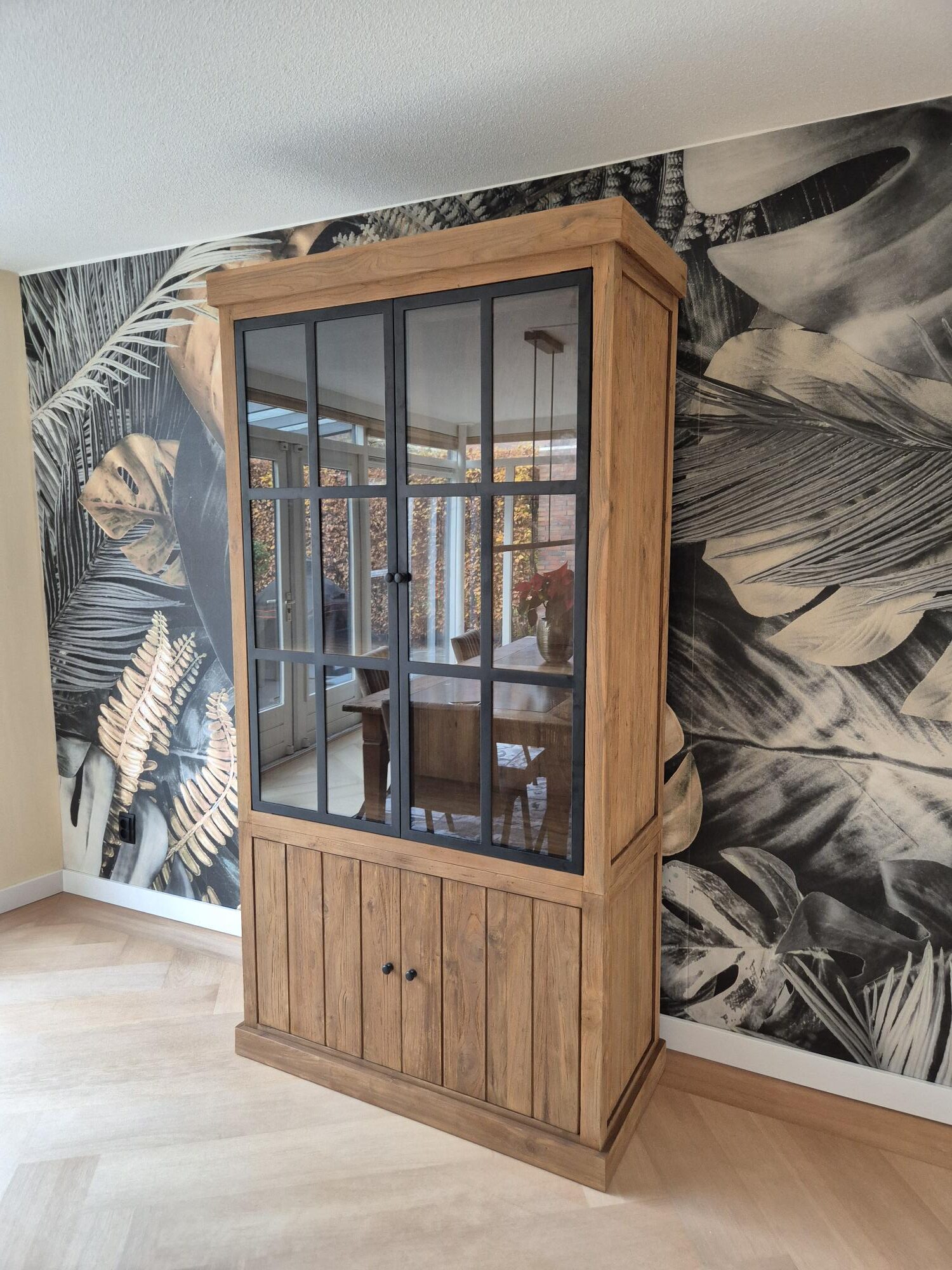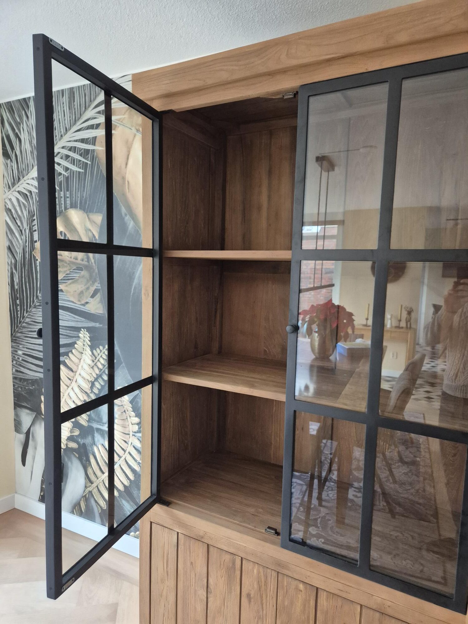 Met zijn royale afmetingen biedt de kast volop bergruimte voor servies, glaswerk of woonaccessoires. De combinatie van hout en metaal zorgt voor een tijdloze industriële look die zowel functioneel als decoratief is.