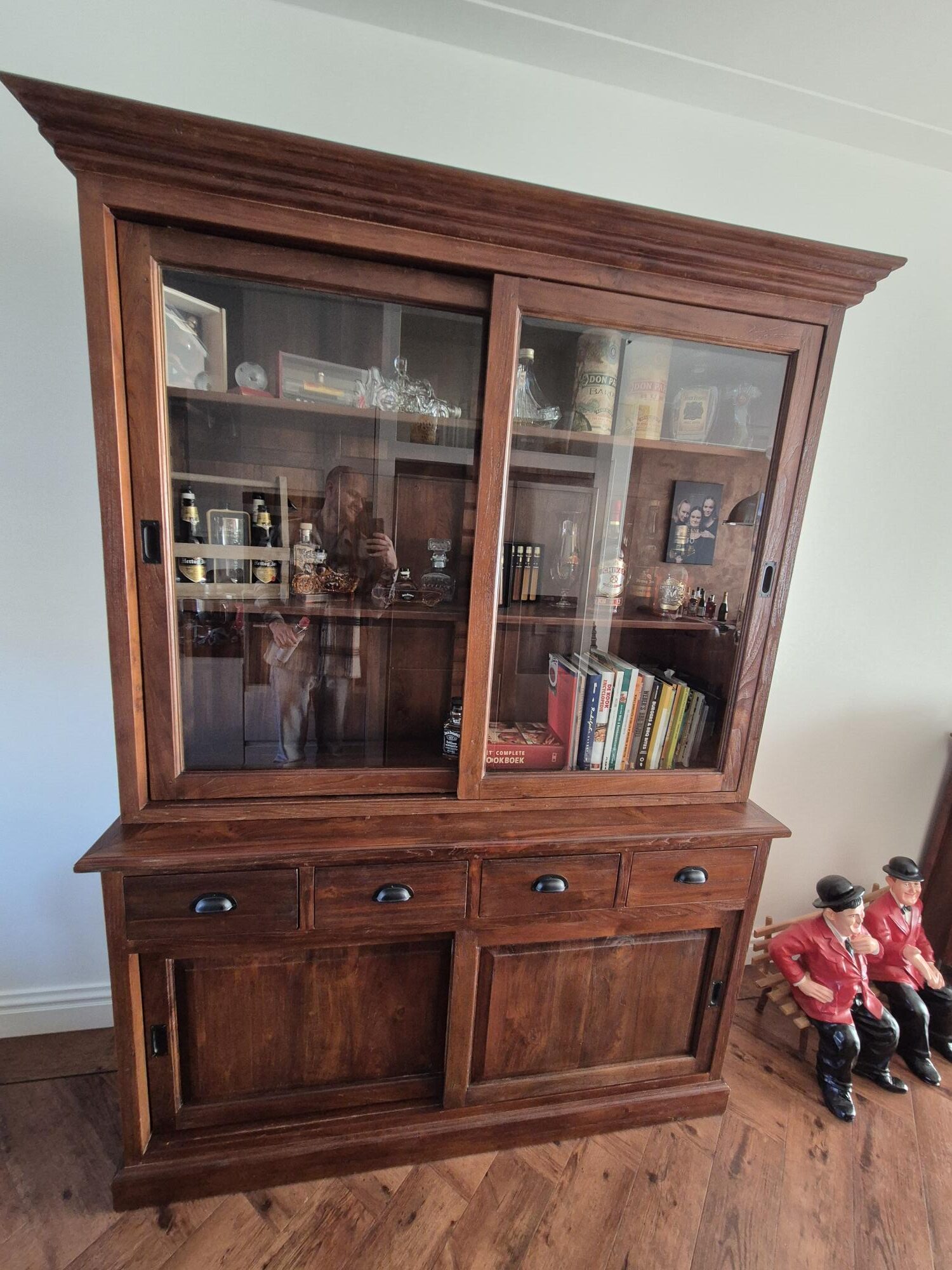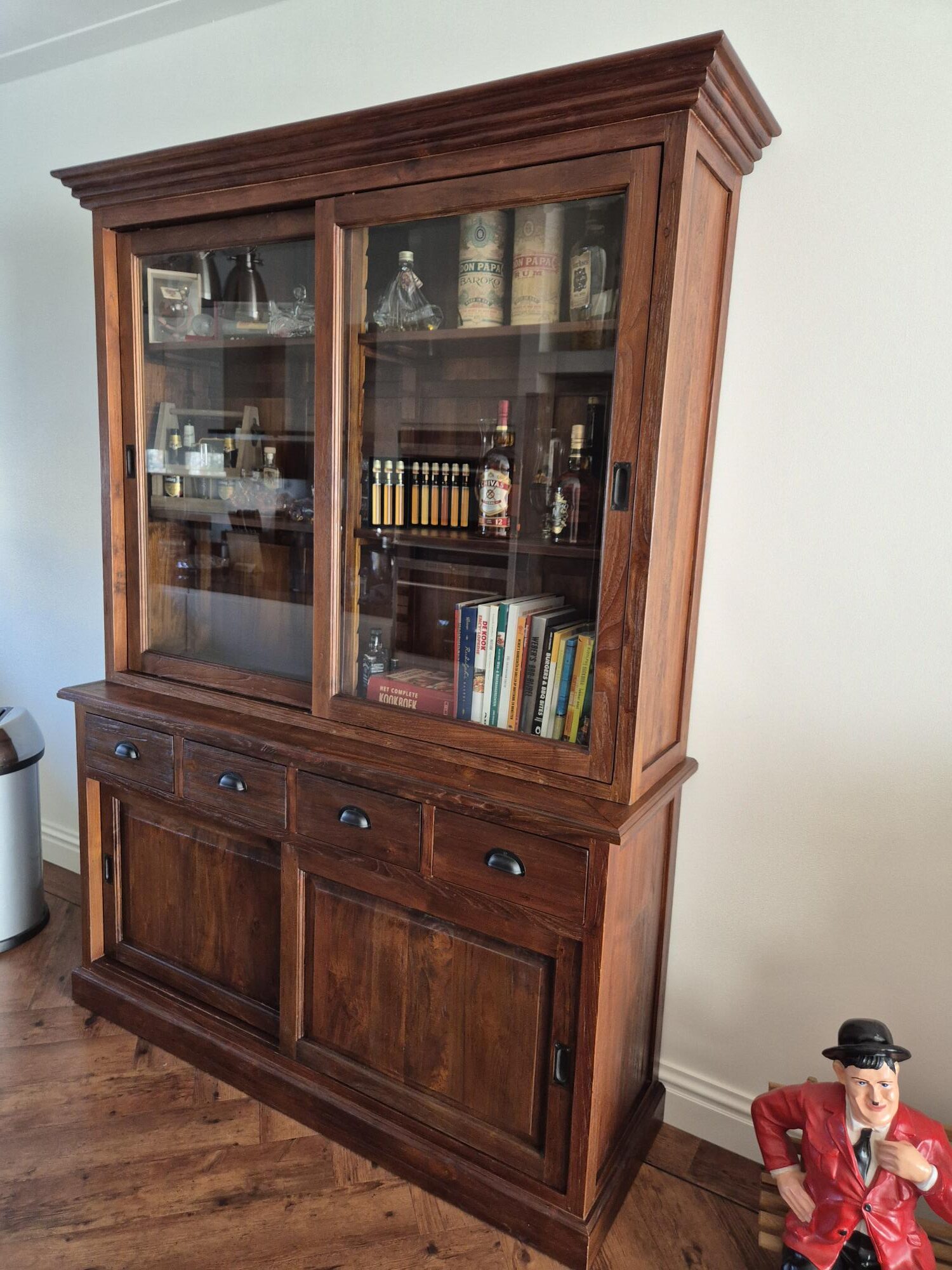 De buffetkast heeft een afmeting van 150 cm breed, 45/35 cm diep en 210 cm hoog en biedt volop praktische opbergruimte. De kast is voorzien van vier schuifdeuren en vier laden, waardoor servies, glaswerk of andere woonaccessoires netjes kunnen worden opgeborgen. De laden zijn afgewerkt met komgreepjes, wat mooi aansluit bij de koloniale stijl van het meubel.