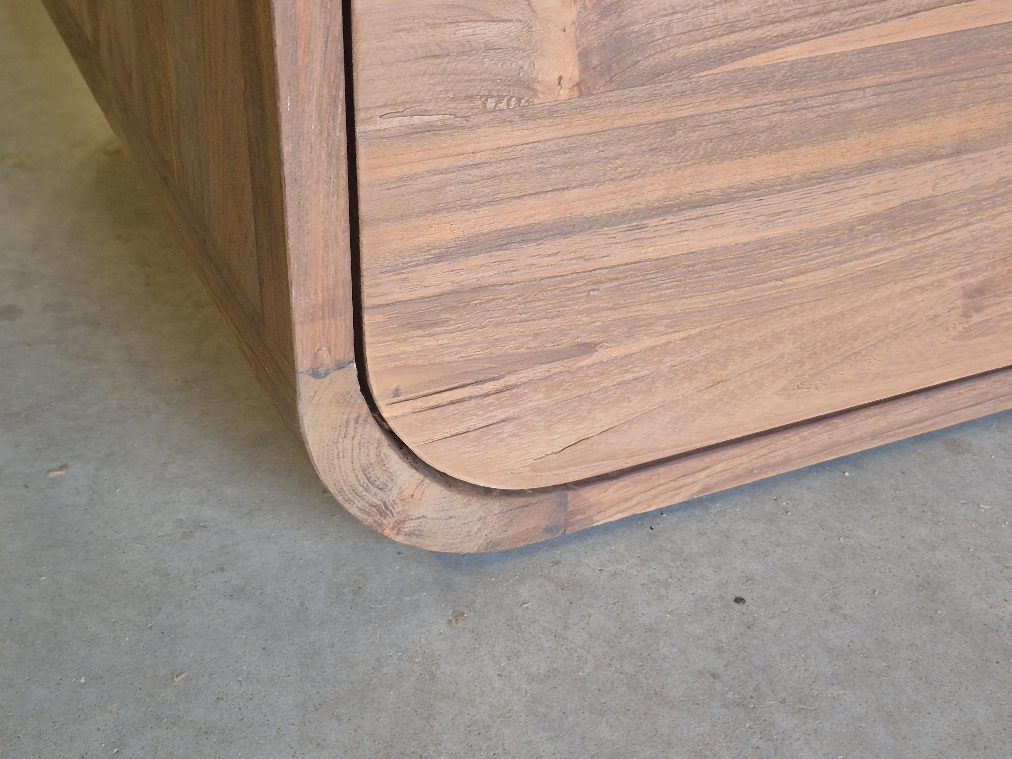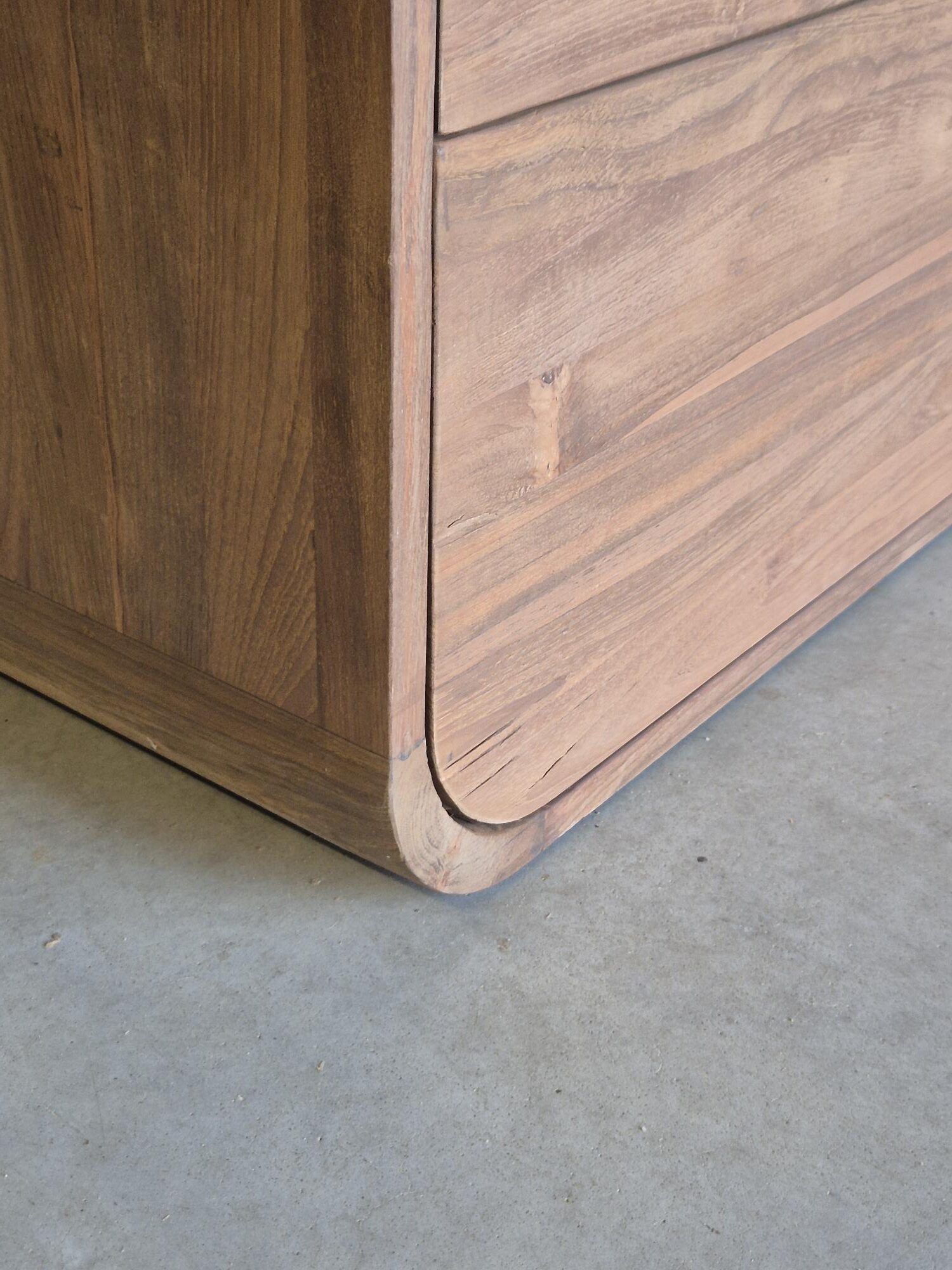 Deze stijlvolle ladenkast van massief teakhout combineert een strak ontwerp met verfijnde details. De kast is gemaakt van gerecycled teakhout en heeft een geborstelde afwerking, waardoor de natuurlijke houtstructuur en warme tinten prachtig tot hun recht komen. Elk meubel is uniek en duurzaam geproduceerd.