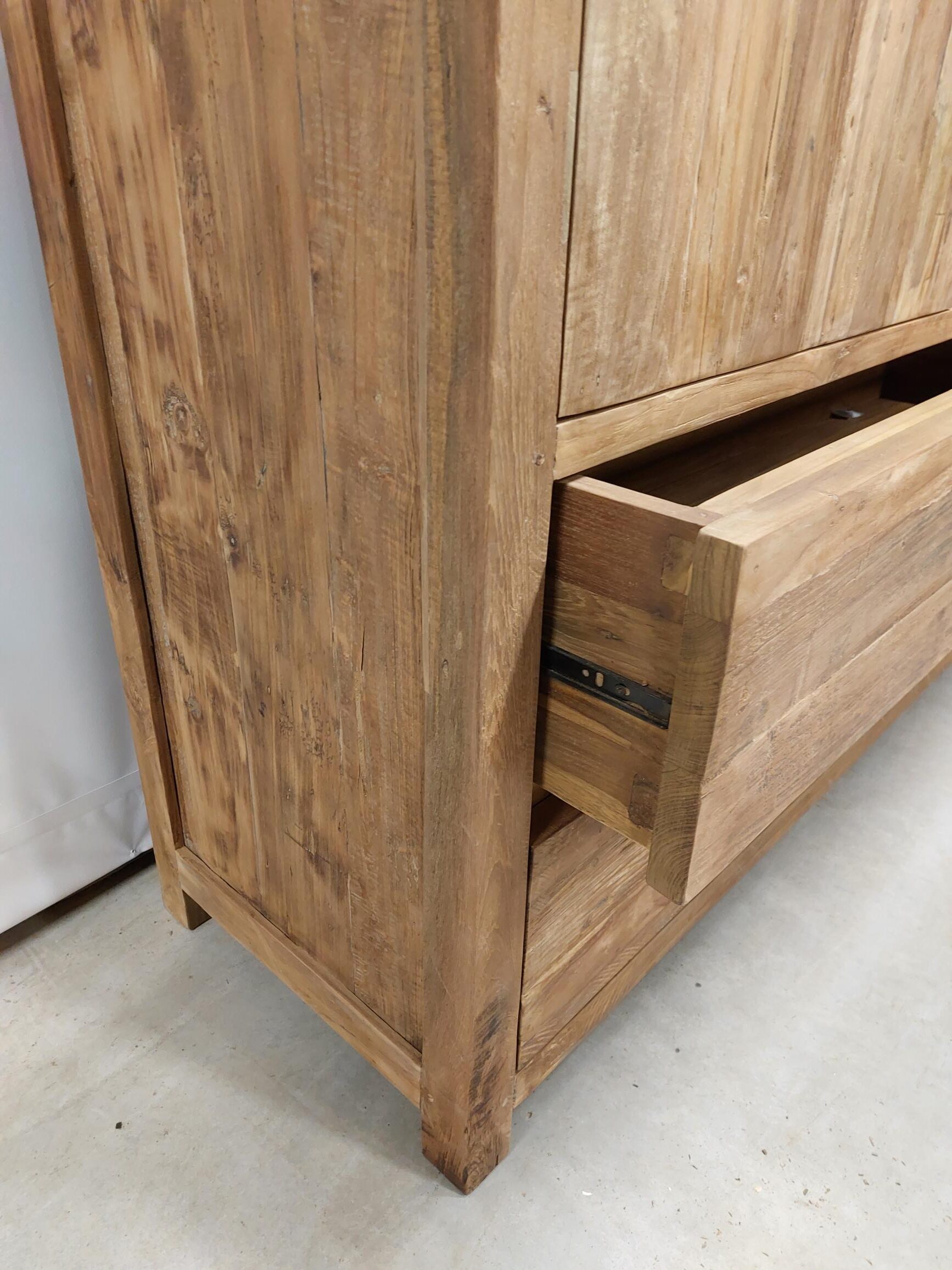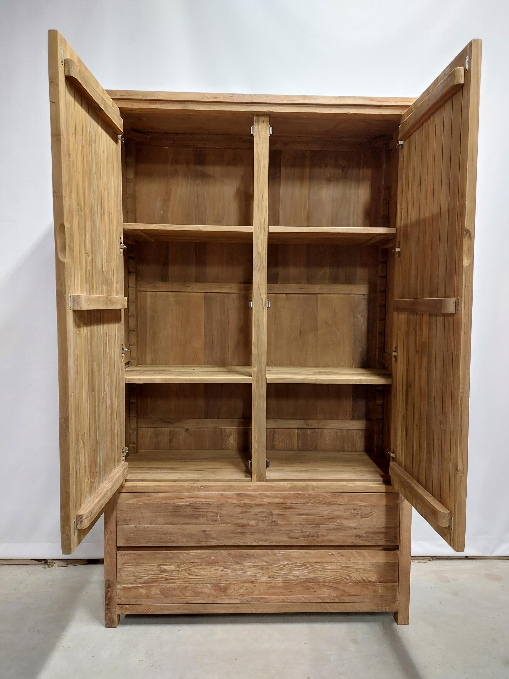 De grote laden onderaan lopen soepel over rails en zijn ideaal voor zware items. Bovenaan zorgen de massieve teakhouten deuren voor een strak, robuust profiel. Binnenin vind je verstelbare schappen, zodat je de kastindeling eenvoudig aanpast aan jouw opbergbehoefte. Elk exemplaar wordt handgemaakt en kan in elke gewenste maat en indeling geleverd worden.