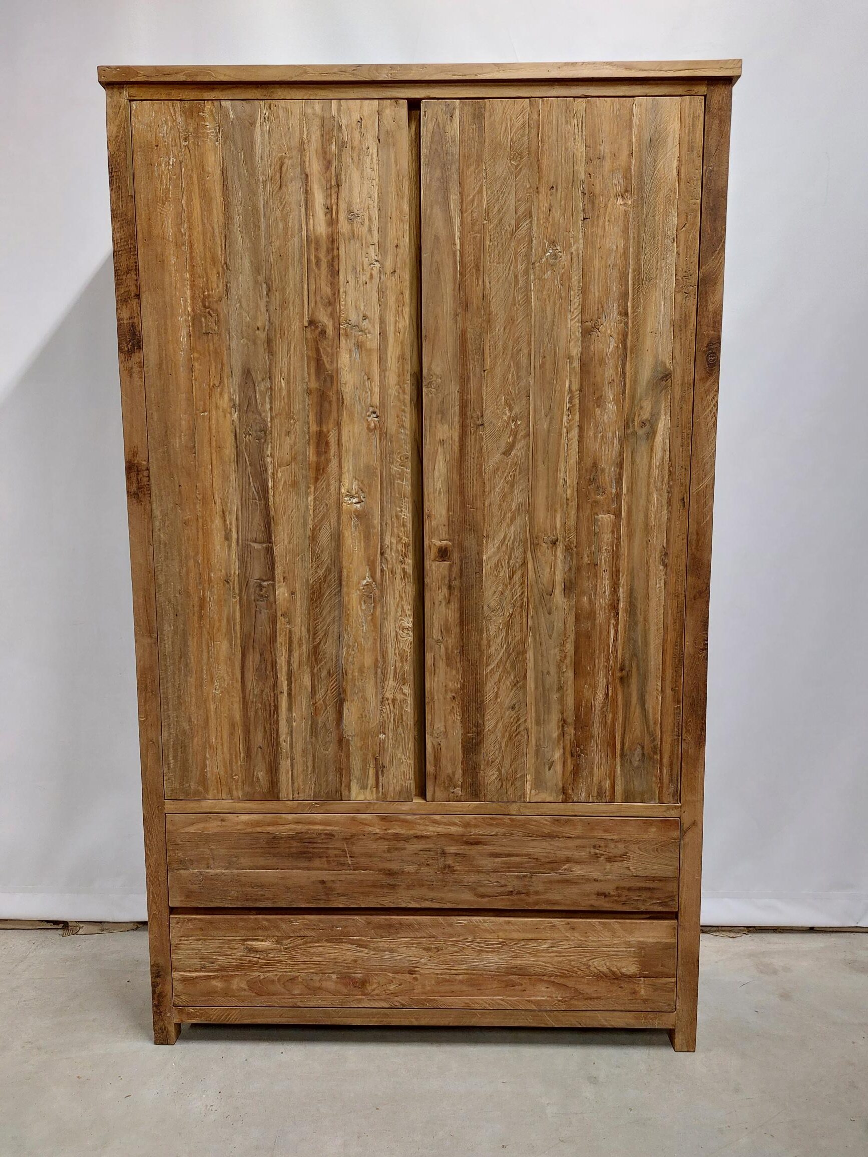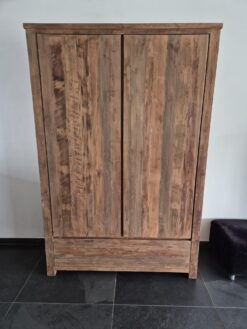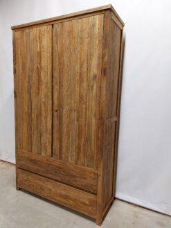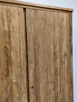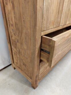 Deze robuuste opbergkast van massief gerecycled teakhout combineert stoer vakmanschap met maximale functionaliteit. Met een breedte van 130 cm, een diepte van 45 cm en een hoogte van 220 cm biedt deze kast voldoende opbergruimte en een krachtige uitstraling die past in zowel landelijke als industriële interieurs.
