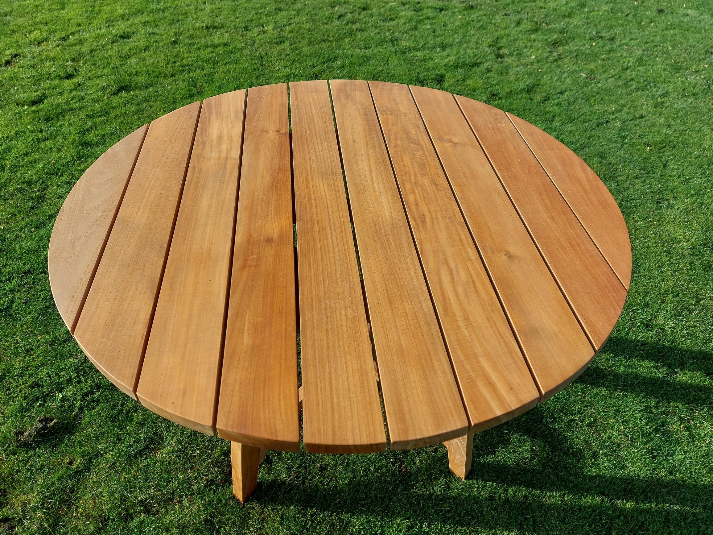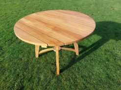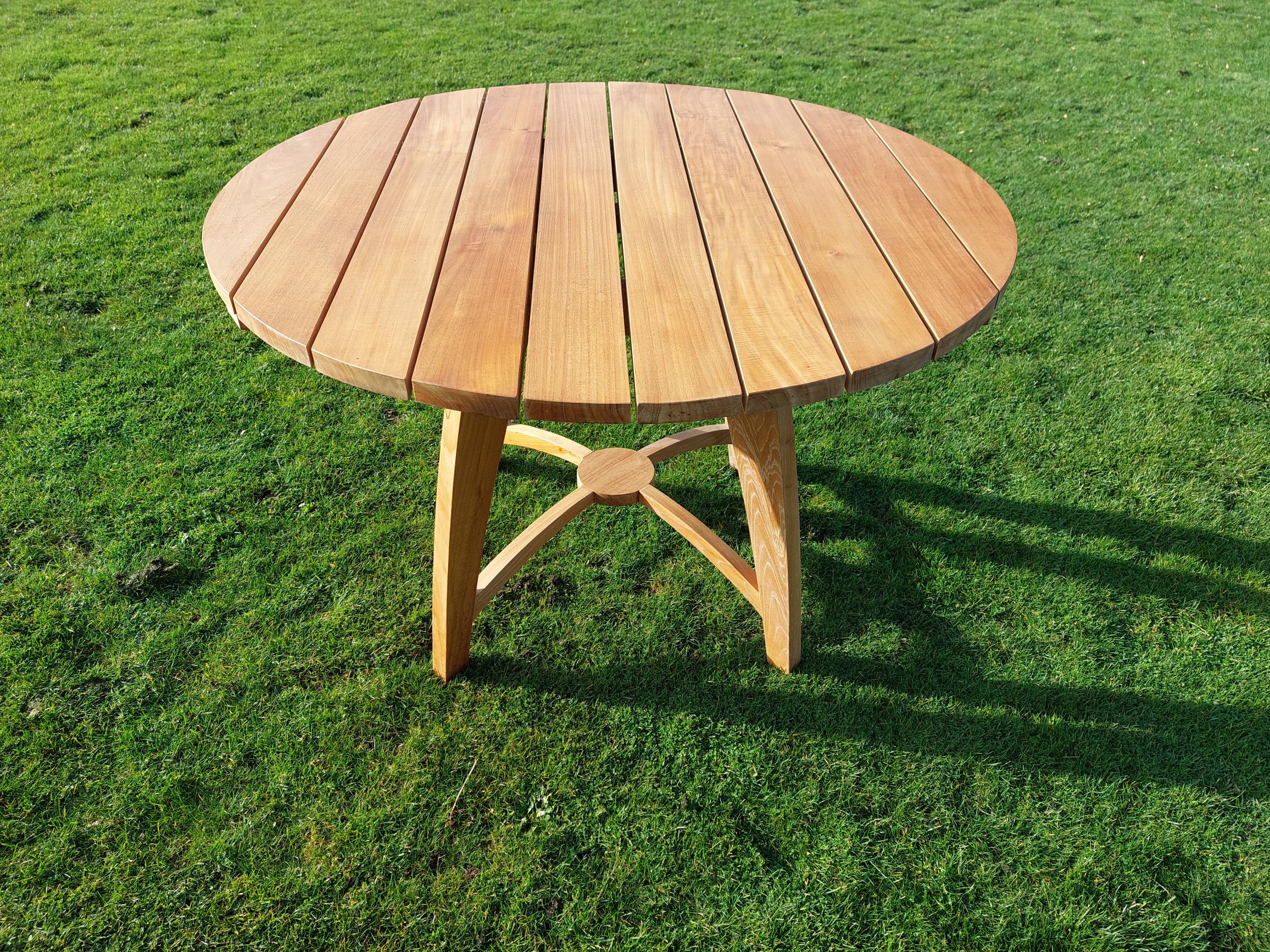 Deze ronde massief teakhouten tuintafel is 120cm groot. Het tafelblad is 3cm dik.