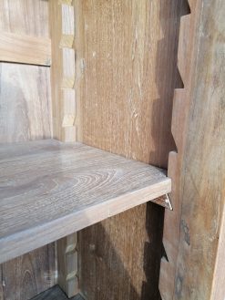 De buffetkast is vervaardigd uit oud teakhout, wat zorgt voor een warme uitstraling en een unieke houtstructuur. Het hout is standaard glad afgewerkt, maar kan naar wens ook geborsteld of uitgevoerd worden in een rustieke teakhoutlook voor een meer doorleefd karakter.