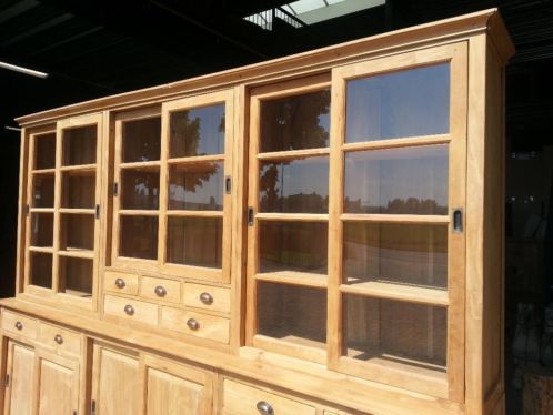 Het is aan de buitenkant niet te zien maar deze riante buffetkast bestaat uit zes delen. Zo is deze vitrinekast eigenlijk in iedere woning te plaatsen. Deze buffetkast is 285cm breed, 45/35cm diep en 230cm hoog.