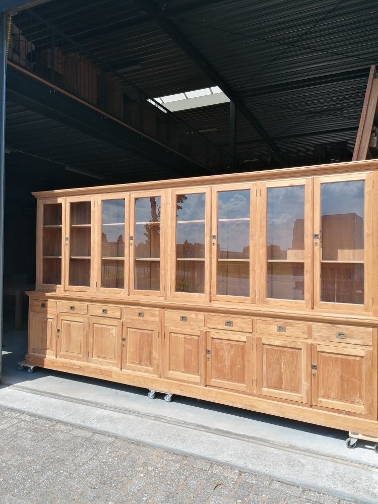 Deze imposante teak buffetkast van 400 cm breed is een echte eyecatcher in ieder interieur. Met zijn royale afmetingen van 400 cm breed, 220 cm hoog en 50/40 cm diep biedt deze kast uitzonderlijk veel opbergruimte en is hij ideaal voor grote woonkamers, woonkeukens of horeca-interieurs.