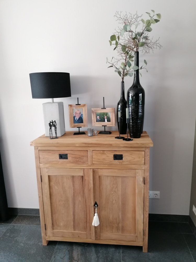 Deze teakhouten meidenkast is 100cm breed, 50cm diep en 100cm hoog. Achter de deuren is een schap gemaakt. Het oude teakhout is in dit voorbeeld geborsteld afgewerkt.