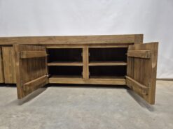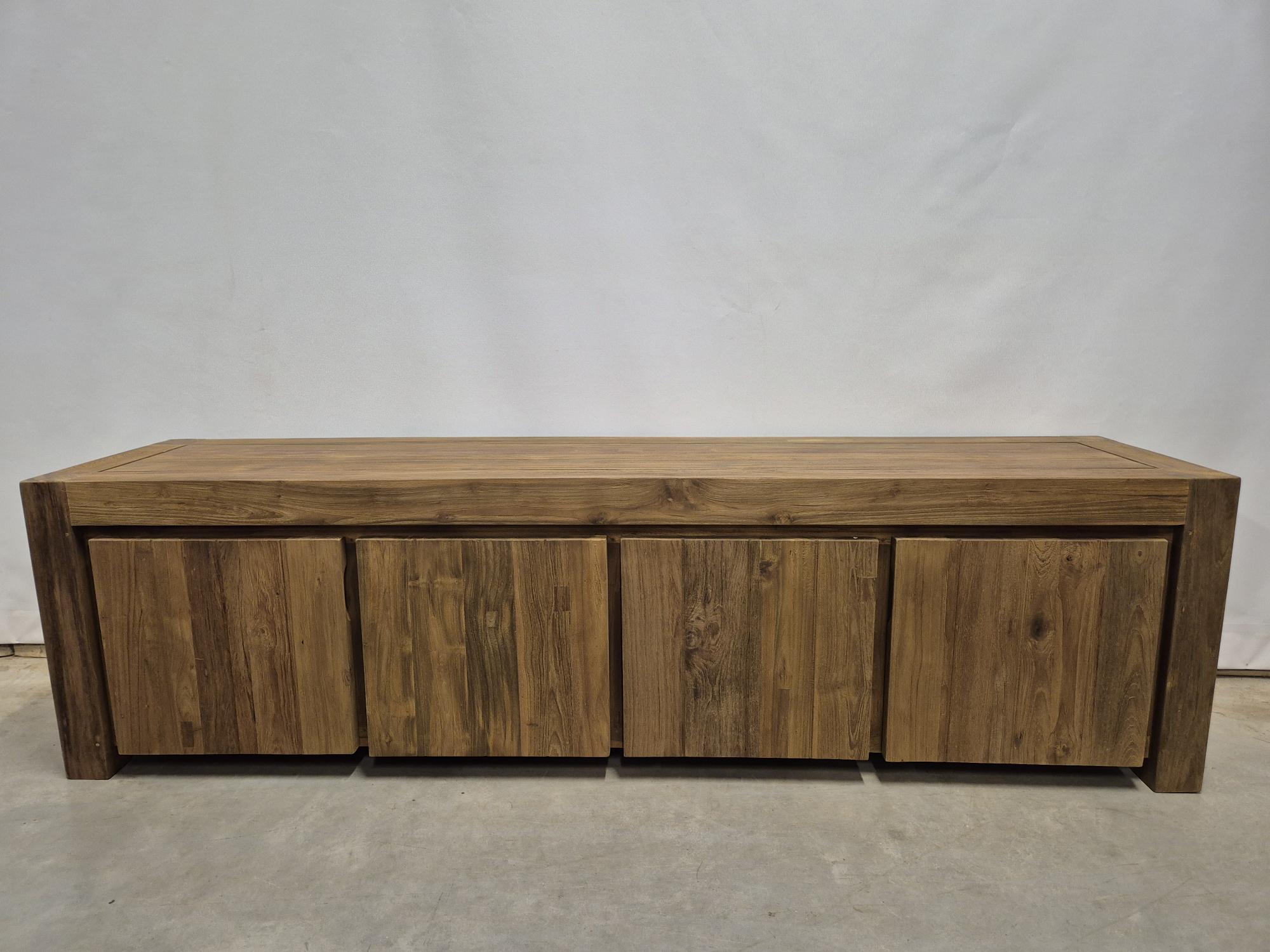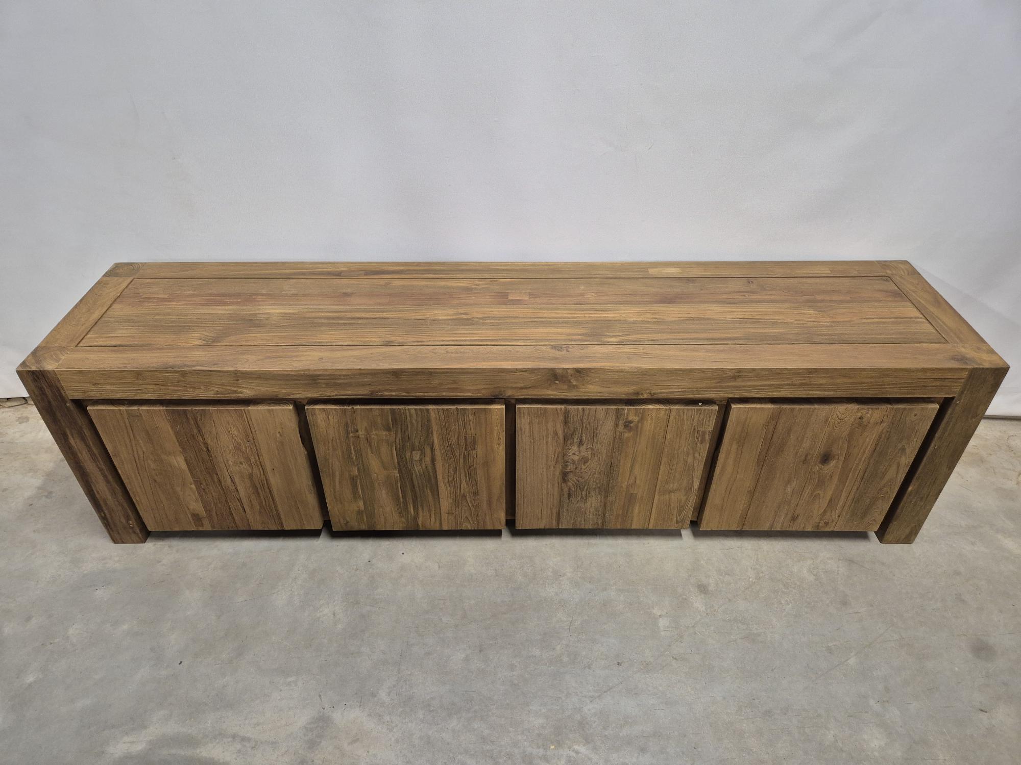 Ontdek dit massief teakhouten TV meubel met deuren van 200 cm breed, 50 cm diep en 50 cm hoog. Gemaakt van oud gerecycled teak met een geborstelde afwerking, straalt dit meubel een robuuste en warme sfeer uit. Achter de twee massieve deuren vind je royale schappen voor al je media-apparatuur en accessoires.